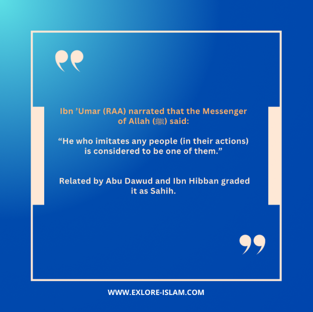Prophet Muhammad (peace be upon him) said in the Hadith: “Whoever imitates a people is one of them.” (Sunan Abu Dawood)